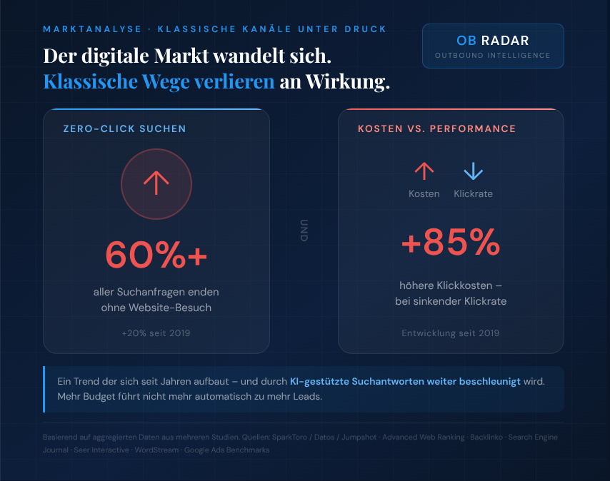 Jede Stunde die Ihr Vertrieb mit Kaltakquise verbringt, ist eine Stunde weniger im Abschluss. Recruiting- und Marketingagenturen im DACH-Raum kämpfen täglich um Aufmerksamkeit – bei steigenden Kosten und sinkender Wirkung klassischer Kanäle. Wir identifizieren die richtigen Entscheider, sprechen sie gezielt an und liefern gebuchte Termine direkt in Ihren Kalender. Ihr Team konzentriert sich auf das was zählt: Abschlüsse.